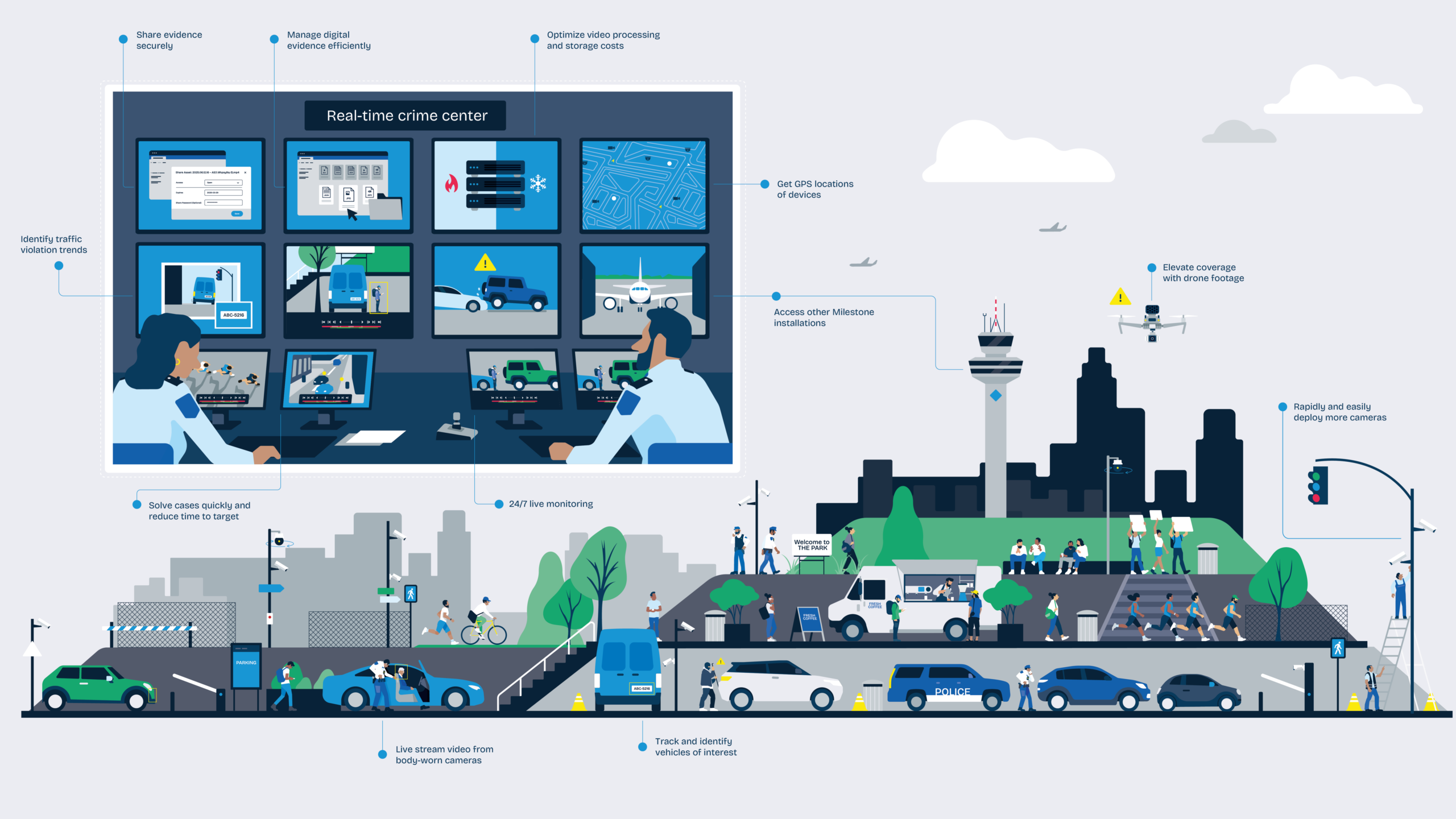 We implement comprehensive video surveillance solutions for various environments and purposes. Our projects have ranged from individual device installations to hundreds of video surveillance devices. We offer end-to-end solutions, including hardware and software such as surveillance cameras, accessories, communication networks, video recorders, surveillance computers, and video management software.